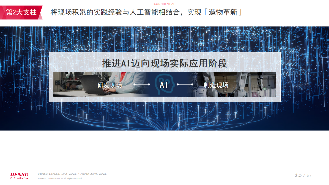 人工智能已进入现场落地应用阶段,现场积累的实践经验价值正重新凸显。我们认为,这将成为推动竞争力提升的重要资本,也是 DENSO 现场所积累的庞大实践知识迎来重大机遇的契机。电装的研发与生产现场,蕴藏着支撑 “高品质、高效率制造能力” 的海量且难以复制的实践经验。我们将开发适用于现场的人工智能技术,通过与实践经验相结合,加速实现卓越的 QCD(品质、成本、交付期)目标。同时,依托人工智能应用推动工作方式变革,助力员工向高附加值业务转型。为实现这些目标,我们将以爱知县西尾市善明南新工厂为试点,持续推进相关挑战。通过这一举措,将现场打磨的制造能力提升至卓越水平,引领全球制造业变革。
