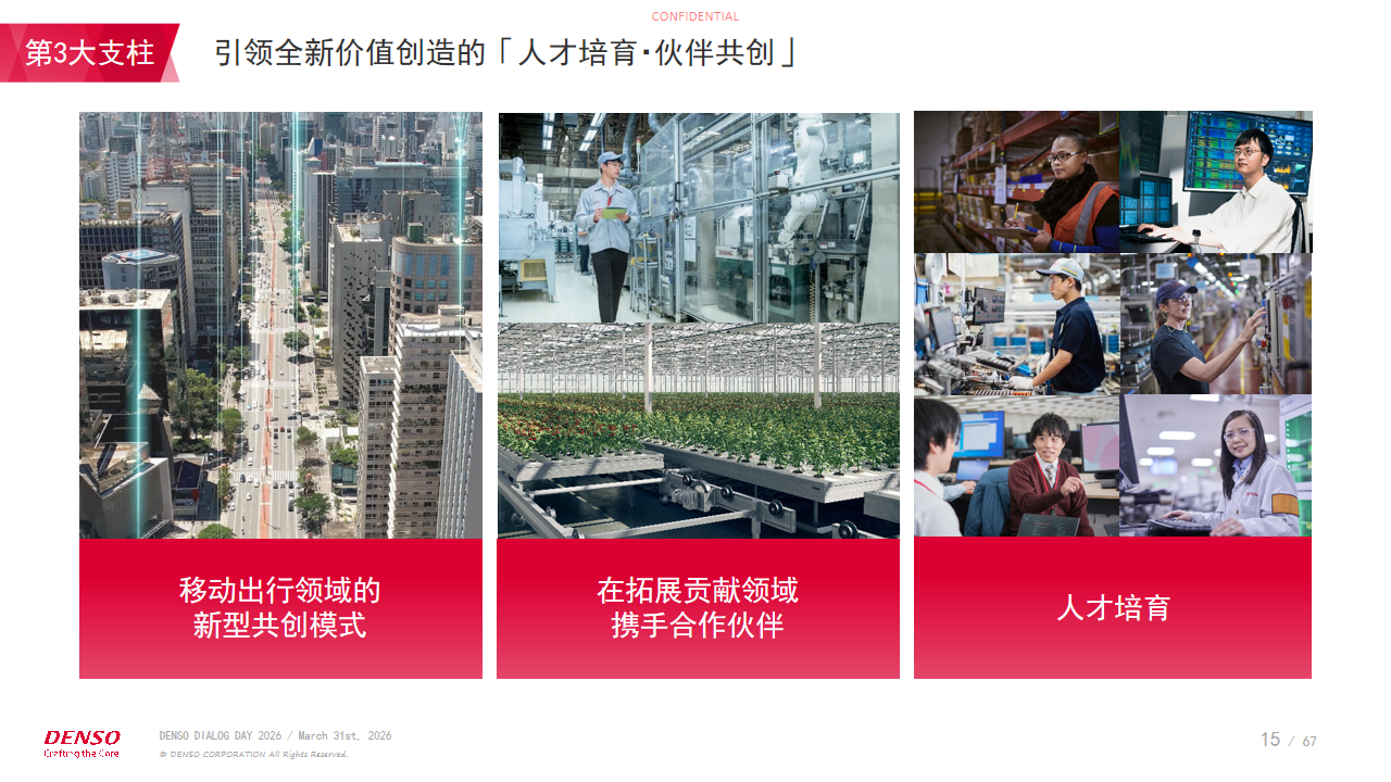 在制定「CORE 2030」计划时,我们描绘了理想的未来愿景。在移动出行领域,我们将在推动基础技术持续进化、创造更高价值的同时,为构建与城市及社会深度融合的生态系统贡献力量,支撑民众生活与产业发展。此外,我们将把在移动出行领域积累的技术拓展至其他领域,突破移动出行边界,为社会广泛提供新型价值。电装将以 “激发人的潜能,从移动出行出发赋能未来社会” 为企业定位,持续为实现理想未来而不懈挑战。
