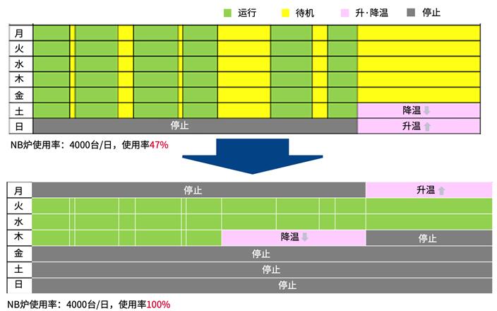 秉承着精益生产,消除所有浪费的生产理念,电装着手于提高能源利用效率,消除浪费的生产改善措施。通过将耗能最大的NB炉设备的生产状态可视化并结合计划进行集中生产,连续运行NB炉,削减待机时间。通过上述消除浪费的节能行动,NB炉的使用率从原本的47%提升至100%*2。大幅提高能源利用率和员工工作效率,减少工时和待机时间,从而促进实现生产据点的降本增效。
