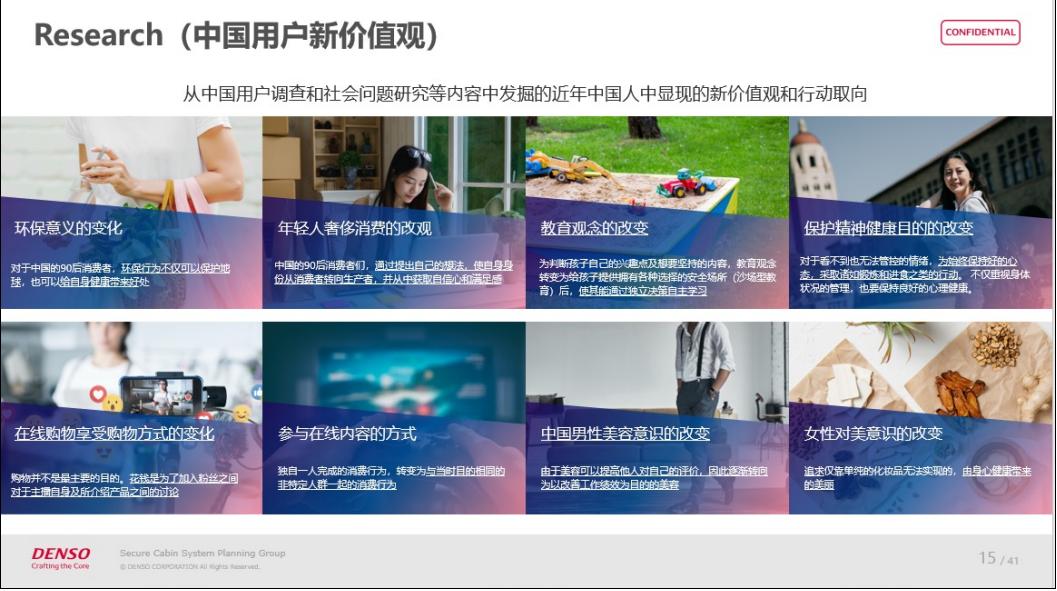 随着社会经济的全面发展,中国用户逐渐产生了新的价值观。电装通过深入调研发现,当下中国用户高度关注环境保护,享受在线购物等新的购物方式,男性和女性都更加关注美容与颜值,注重保持身体和心理的健康,教育观念和消费观念都有所转变……种种变化与新价值观、消费观的形成,最终都会在潜移默化中影响到用户的用车需求。