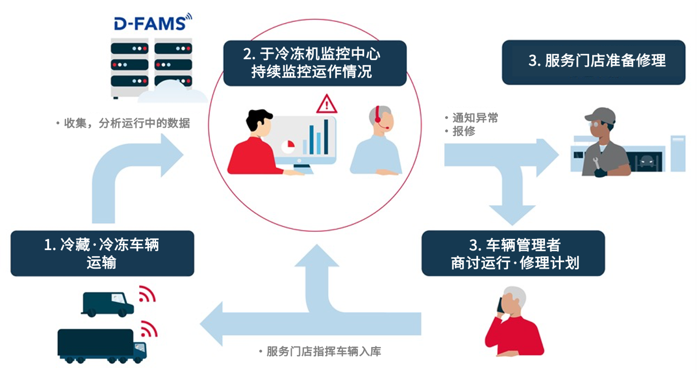 电装所开发的D-FAMS可将通信设备加装到冷冻机上,将冷冻机的操作数据传送到服务器,以服务器上分析的数据为基础,再由电装冷冻机监控中心*2实时远程监视冷冻机的状态,在监测到冷冻机的故障或异常情况迅速跟进处理,减少因故障导致无法出车、或配送过程中发生故障导致商品品质受损的几率。不需要为了车辆检测而停止运营,助力维持车辆的运转率同时降低运行管理者负荷。此外,通过更大限度地减少制冷剂(替代氟利昂)在冷冻机故障时的泄漏,减少氟利昂的排放,促进环境保护。
