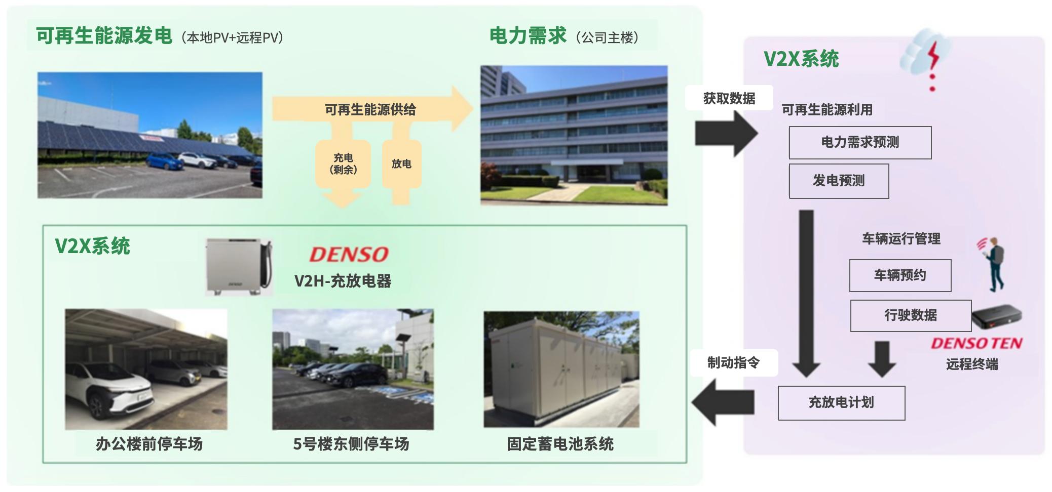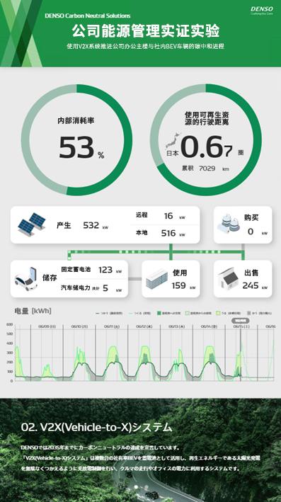 在本次实证中,电装导入了V2X(Vehicle to X)*1系统,该系统可实现车辆与多种物品之间的信息和能源联动,通过智能整合太阳能发电设备(包括远程及本地)与公司内部的BEV*2车辆以及固定蓄电池,系统优化了电力的使用和管理,助力实现电装公司内部的BEV车辆和总部主楼(一座六层的办公建筑)的碳中和目标。