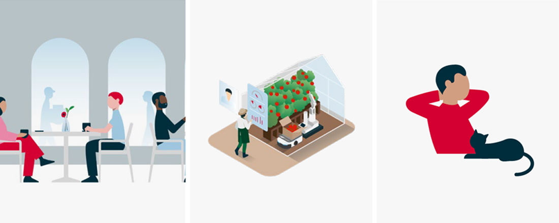 A 2D illustration shows the complex technologies related to mobility, social issues, and their solutions. These illustrations are composed of simple, contemporary elements that create a positive impression and closely linked to the DENSO brand.