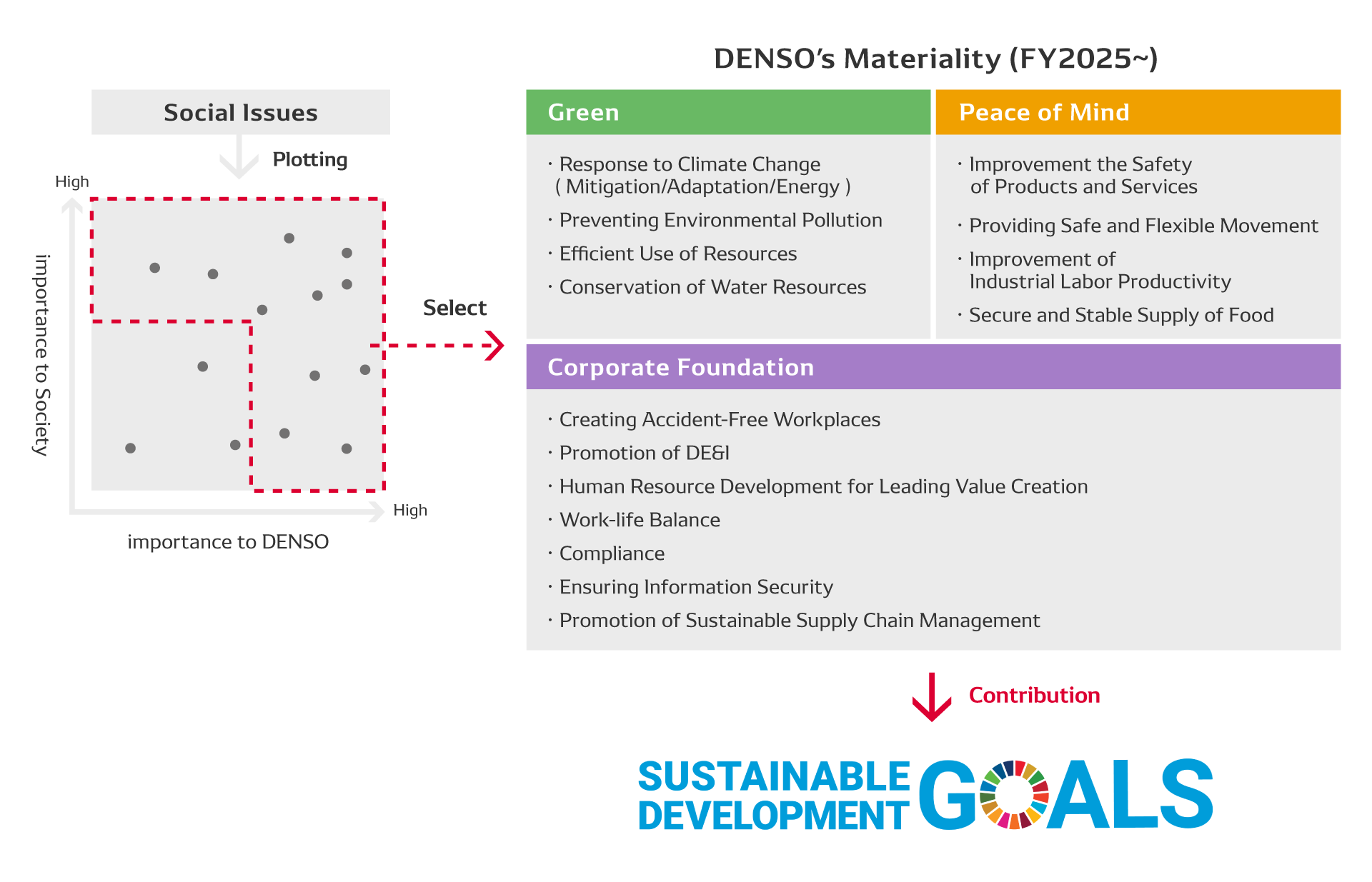 In recent years, DENSO has reviewed and updated the material issues (Materiality), most recently last year, to reflect changes in social issues and the business environment surrounding its operations.