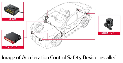 This product uses displays and buzzers to inform the driver when ultrasonic sensors attached to the bumper detect an obstacle in a vehicle’s course when the gas pedal is pressed while the vehicle is parked or stopped. If the driver continues to apply strong pressure to the gas pedal, mistaking it for the brake pedal, the device will limit acceleration to reduce the force of any resulting collision. Furthermore, if a driver is backing out of a parking space or otherwise putting their vehicle in reverse, the device will limit excessive acceleration if the gas pedal is pressed to an extent that would result in speeds of over 5 km per hour, even if an obstacle is not detected.