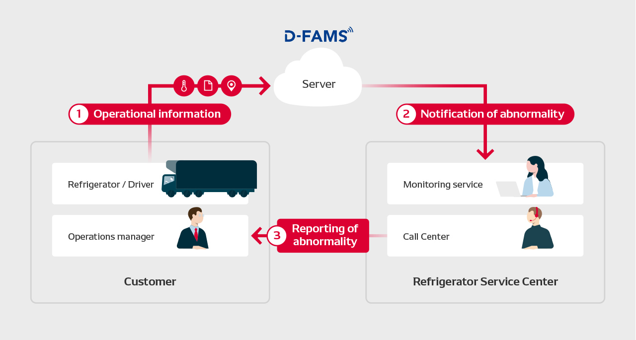 "D-FAMS*" enables remote monitor and management of refrigerating unit on trucks by analyzing its operating status.
