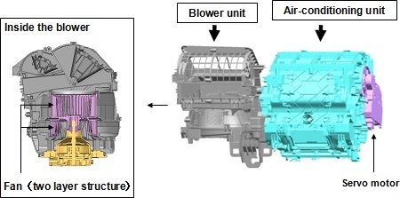 "Many of the subcomponents for this product, such as air mix door, servo motor and blower fan were newly developed, which enabled to reduce the unit's size by 20 percent compared to DENSO's conventional model, and significantly standardized the unit,"