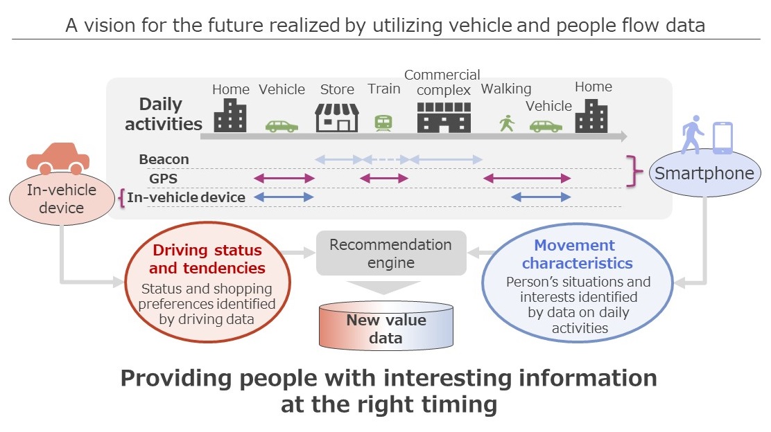 ・ Recommending*4 interesting stores at effective timings by analyzing users’ preferences based on data on drivers’ driving characteristics and driving situations gathered from in-vehicle devices, and on their movement characteristics gathered from the GPS in their smartphones and beacon detection logs