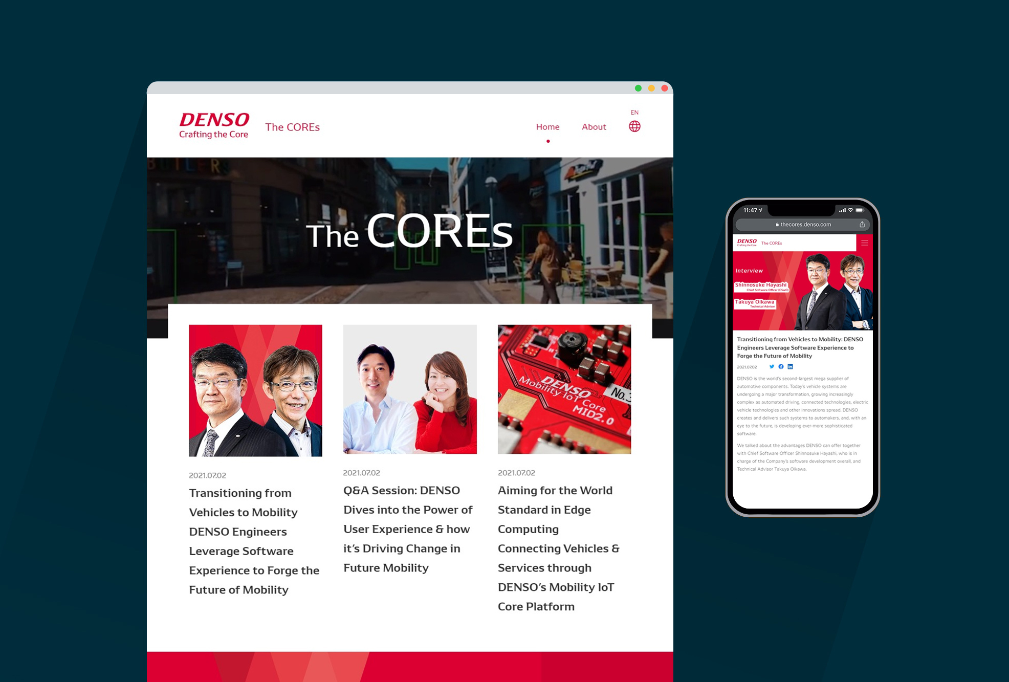 Through the new media website “The COREs”, DENSO aims to communicate with this emerging mobility-centered society, providing information on its technologies, software solutions, and the working styles of the many engineers behind DENSO’s operations.