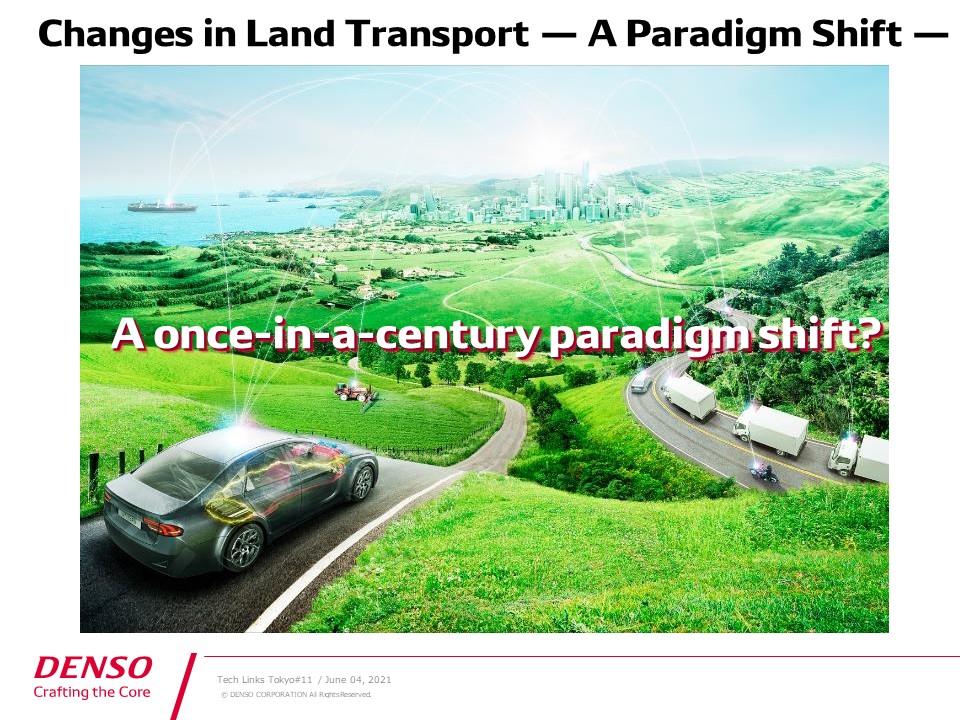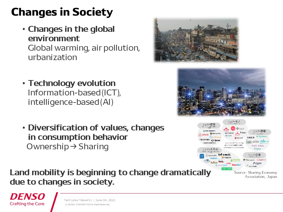 Shingo Nakata: I’m Shingo Nakata of DENSO. Today I’d like to explain two reasons why DENSO is working on electric aircraft: “changes in land transport” and “an air mobility revolution.” I’ll then talk about flying cars as defined by DENSO.
