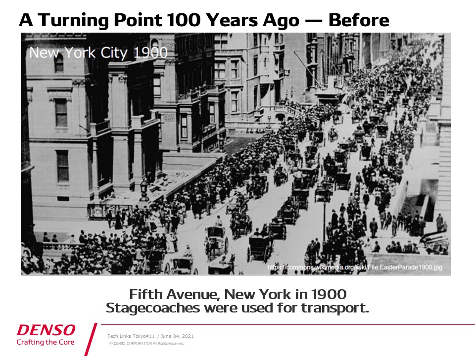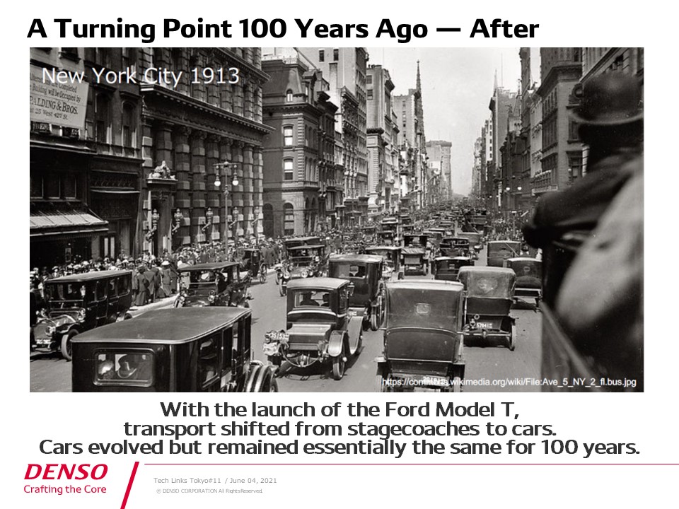 First, I’d like to explain why DENSO has become involved with electric aircraft. Today, the auto industry is undergoing a once-in-a-century paradigm shift. Let’s look at what happened 100 years ago.