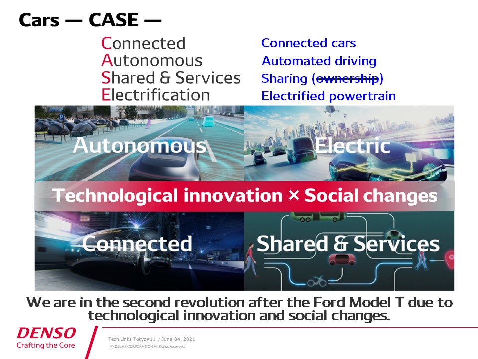 Such changes in society have been accelerating changes in the automotive sector. Due to technological innovation called “CASE,” the cabin, which used to be closed, is now connected with the outside world via the Internet. Driving will be increasingly automated.
