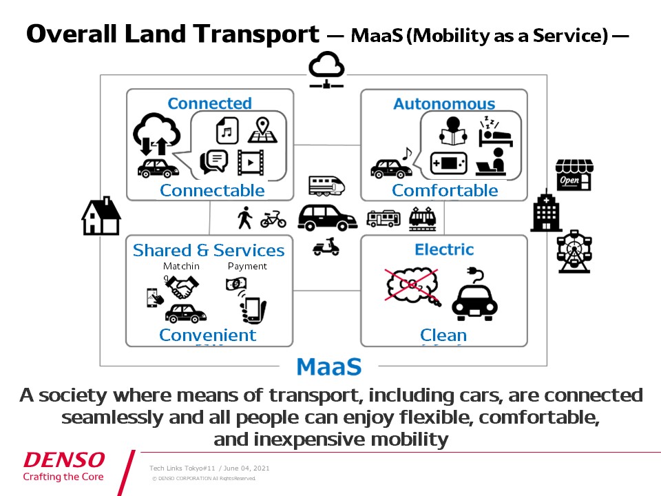 From the viewpoint of overall land transport, including cars, the concept of “MaaS (Mobility as a Service)” is about to become a reality. Specifically, the entire mobility, including shared cars that I mentioned earlier, will be seamlessly connected so that all people can enjoy flexible, comfortable, and inexpensive mobility.