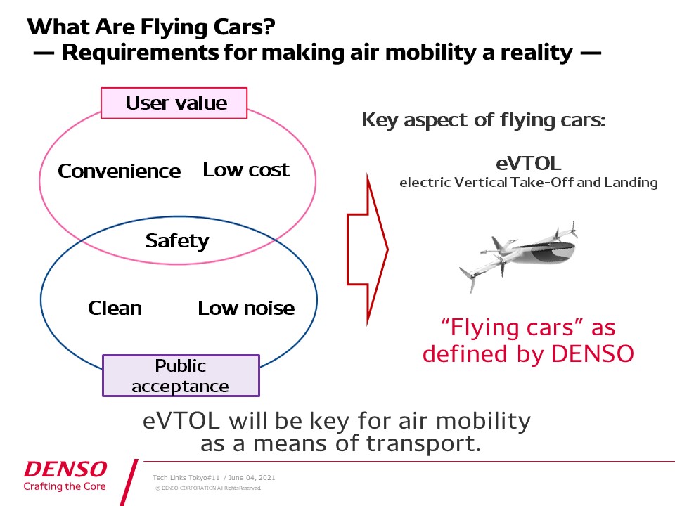 From the viewpoint of public acceptance, they must be clean and quiet. The most important common value is safety. Electric Vertical Take-Off and Landing aircraft, or eVTOL, meet all these requirements. eVTOL is the flying car as defined by DENSO.