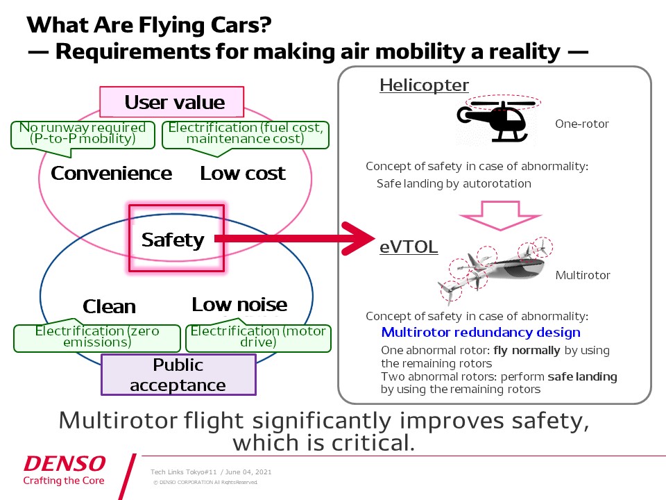 From the viewpoint of public acceptance, they must be clean and quiet. The most important common value is safety. Electric Vertical Take-Off and Landing aircraft, or eVTOL, meet all these requirements. eVTOL is the flying car as defined by DENSO.