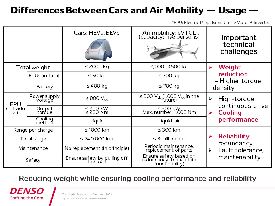 The weight of an EPU includes both motors and inverters. As this table shows, an automotive EPU weighs about 50 kilograms, whereas an air mobility EPU weighs about 300 kilograms, which gives a very high percentage of the total weight.