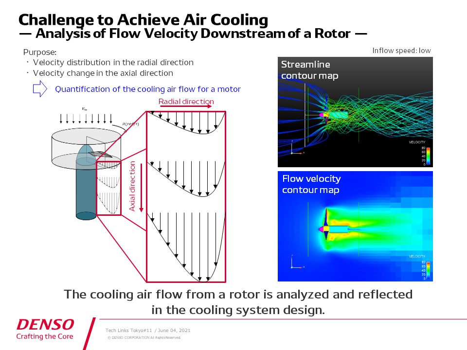 To achieve air cooling, we conduct a simulation analysis of the velocity distribution in the radial direction and the velocity change in the axial direction. We also analyze the velocity distribution downstream of a rotor to quantify the air velocity for a motor depending on the layout.