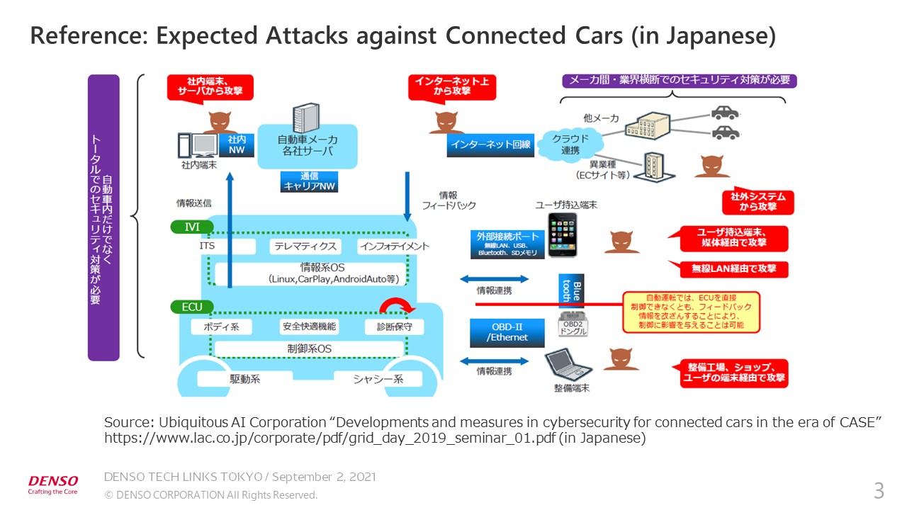 As EVs spread, new taxes, such as the road tax on EVs, will be levied. The services which I mentioned earlier will be offered based on various types of in-vehicle sensor information or analytics information. High-accuracy information will help produce high-quality services. As such business spreads, unauthorized access and use will increase.