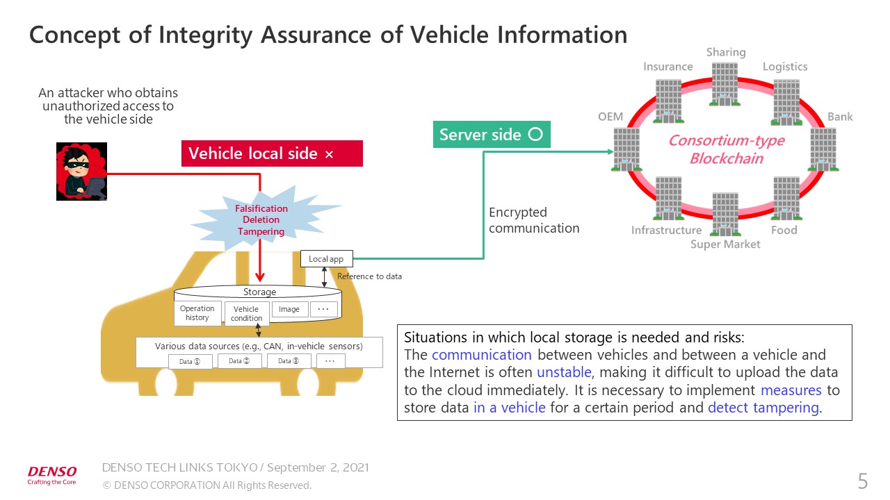 Even if data is stored in a vehicle for a certain period, there are risks of tampering. In other countries, the vehicle ecosystem is well developed and various in-vehicle apps are used. Locally stored shared data may be tampered with by third-party apps, which require real-time access.