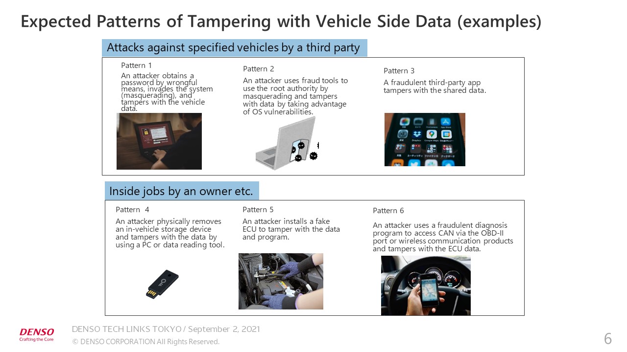 Let’s take a look at specific cases of tampering. As computerization of vehicles has progressed, attackers now hack passwords and take advantage of vulnerabilities in the operating system to use the root authority by masquerading as authentic users and tamper with the data. Customers have often told us that it is very difficult to cope with data tampering by vehicle owners or via the physical interface. Taking measures to prevent tampering increases the manufacturing and operational costs.