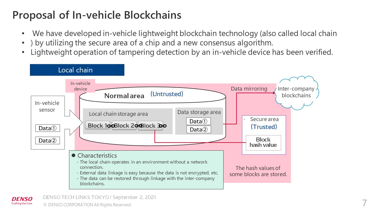 We have also been developing a mechanism to store important information in multiple in-vehicle devices, instead of a single device, and a mechanism to distribute and store the V2V data using blockchains in anticipation of the vehicle architecture in the future. Obviously, in-vehicle blockchains represent only one of the modules, and our in-vehicle defense-in-depth technology and other security mechanisms must also be used to protect the vehicle data.