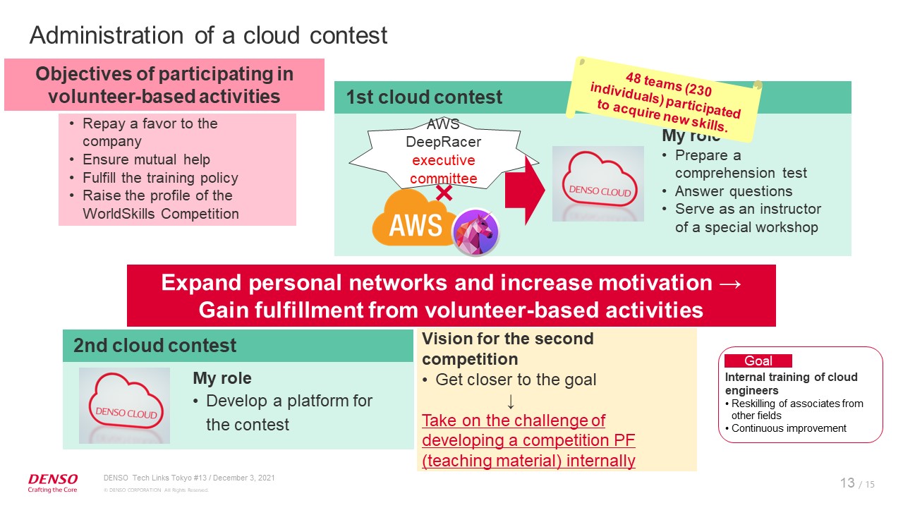 Next, I will talk about the cloud contest. Let me explain why I started to join the voluntary activities. When I became involved in training, I was looking for help for AWS, and came across a team of engineers who were planning a DeepRacer contest.