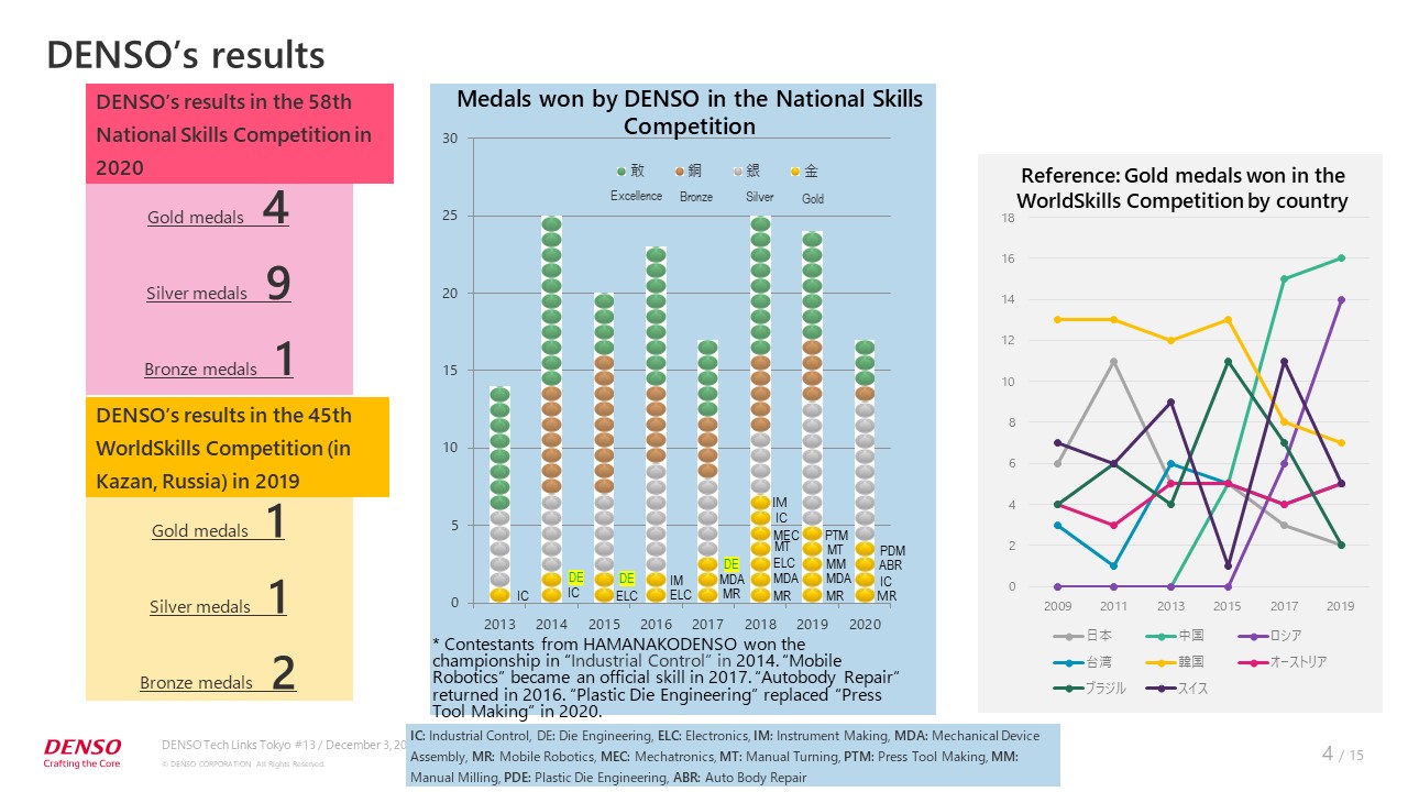 This slide shows DENSO’s results. At the National Skills Competition held in 2020, 27 contestants from DENSO participated in 11 skills and won four gold medals, nine silvers, and one bronze. Contestants from high schools, technical colleges, and universities also take part in the National Skills Competition. Many contestants from companies, including DENSO, compete in various skills.