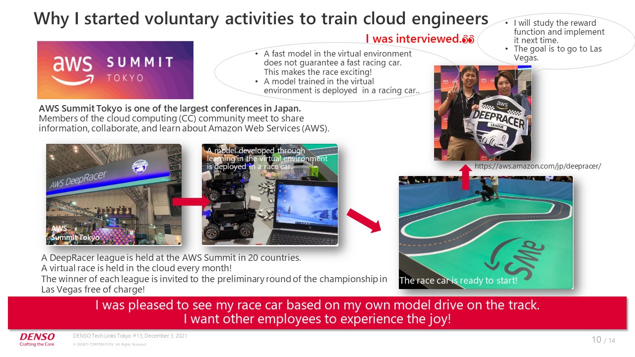 First, let me explain why I started voluntary activities. About three years ago, I participated in “AWS Summit Tokyo,” which was organized by AWS, as part of the in-house AI workshop in the AD&ADAS Business Unit and took part in “DeepRacer,” a racing contest for autonomous racing cars.