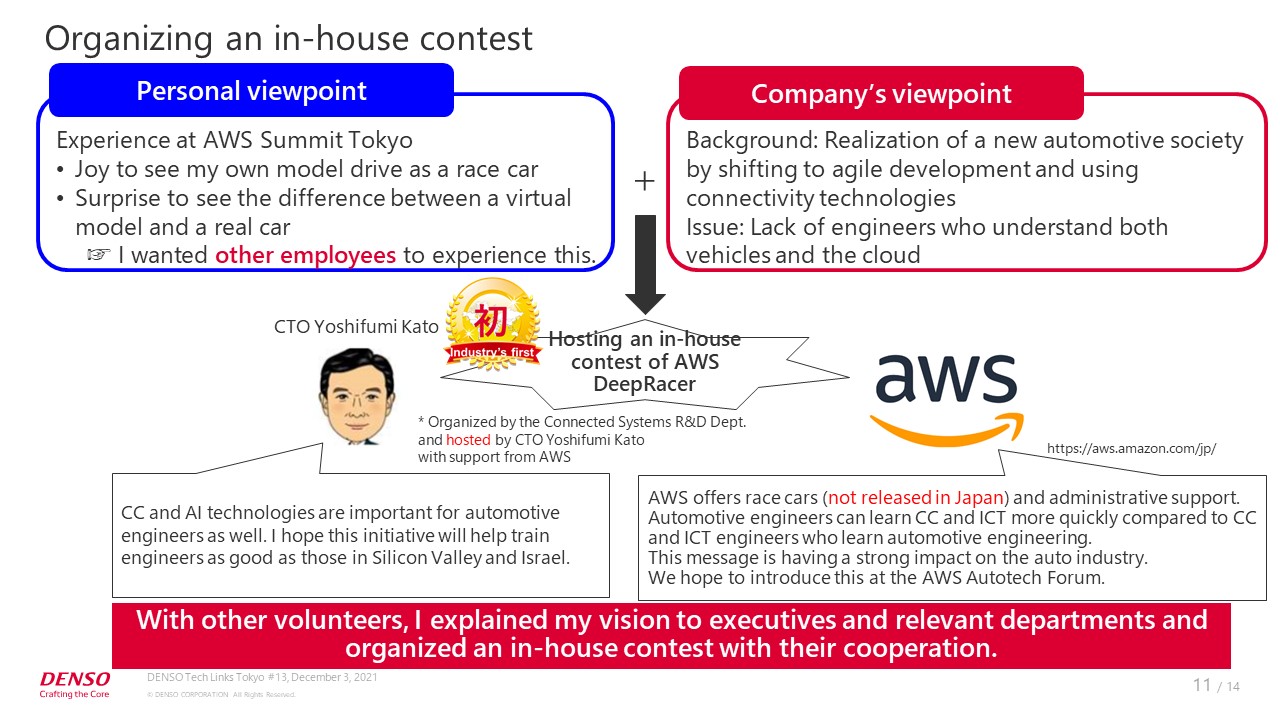 We launched the in-house contest of DeepRacer in 2019. In FY2020, we held a DENSO cloud contest completely online. We were worried that there might be only a few applicants due to the pandemic, but more than 200 employees applied. That was a problem we could enjoy dealing with!