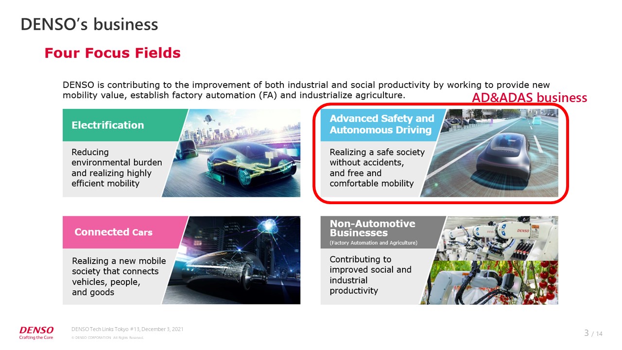 At present, DENSO focuses on four fields: electrification, connected cars, advanced safety/automated driving, and non-automotive businesses. The AD&ADAS Business Unit, which I work for, covers the advanced safety and automated driving field. We aim to realize a safe society free from traffic accidents, with comfortable and flexible mobility.