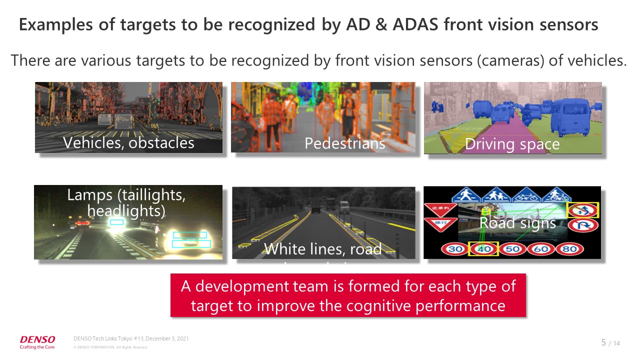 Here are some of the things to be recognized in the images captured by the front vision sensor, which is a camera mounted on the windshield of a vehicle: vehicles and obstacles, pedestrians, driving space, lamps such as taillights and headlights, white lines and road boundaries, and road signs. In my department, there is a development team for each of these types, working to improve the recognition performance.