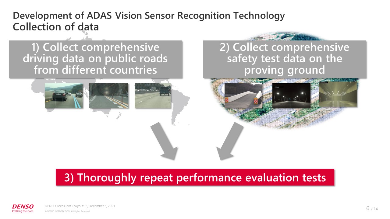 Next, I will explain the development of front vision sensor recognition technology. We collect comprehensive data for public roads in various countries. We also collect comprehensive safety test data on a proving ground. We use this collected data to repeatedly conduct strict performance evaluation tests.