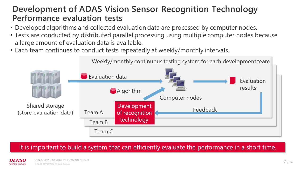 The process is undertaken by each team. Tests are conducted repeatedly at weekly or monthly intervals. Thus, it is important to build a system that can evaluate the performance efficiently at short intervals.