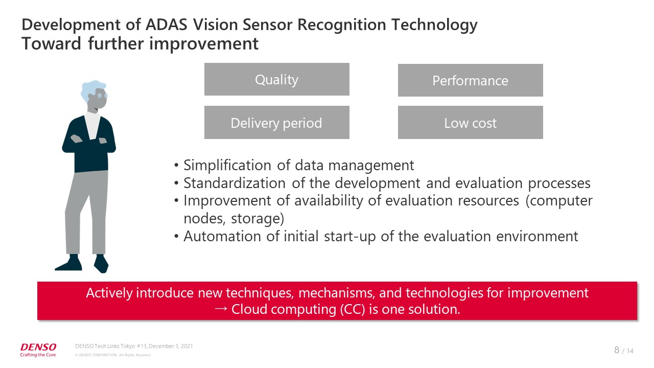 In my presentation, I’ll explain how we are developing ADAS vision sensor recognition technology and our voluntary activities to train cloud computing engineers. In the first part, I will introduce DENSO’s AD&ADAS business and the development flow of ADAS vision sensor technology.