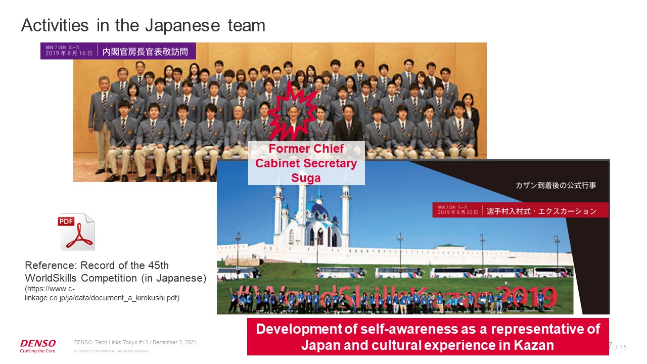 Let me talk about my experience at WorldSkills Kazan. I joined DENSO as a technician. I took the selection exam after receiving training for one year in the advanced vocational training course of DENSO Technical Skills Academy. I was chosen as a contestant for the National Skills and WorldSkills Competitions and took part in them. Today, I serve as an instructor for younger employees.