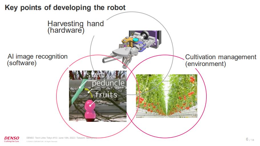 DENSO Tech Links Tokyo #15 was held on the theme of DENSO’s vision for “manufacturing plants” for agriculture. It introduced “Profarm T-cube,” a next-generation agricultural greenhouse which was developed to make agriculture accessible to anyone, anywhere; “AgriD,” a large-scale agricultural greenhouse; and “FARO,” an automated tomato harvesting robot. Takaomi Hasegawa of the Food Value Chain Business Development Div., DENSO Corporation, gave a presentation on the development of FARO, an automated tomato harvesting robot.