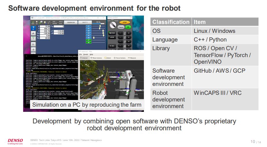 Regarding the infrastructure, we use GitHub, AWS, and GCP to manage the software version. We use both open software and DENSO’s proprietary robot development environment. Specifically, we use WinCAPS III as the integrated development environment for the robot and VRC as the robot emulator, and combine these environments for development. The figure on the left shows what can be done through this combination.