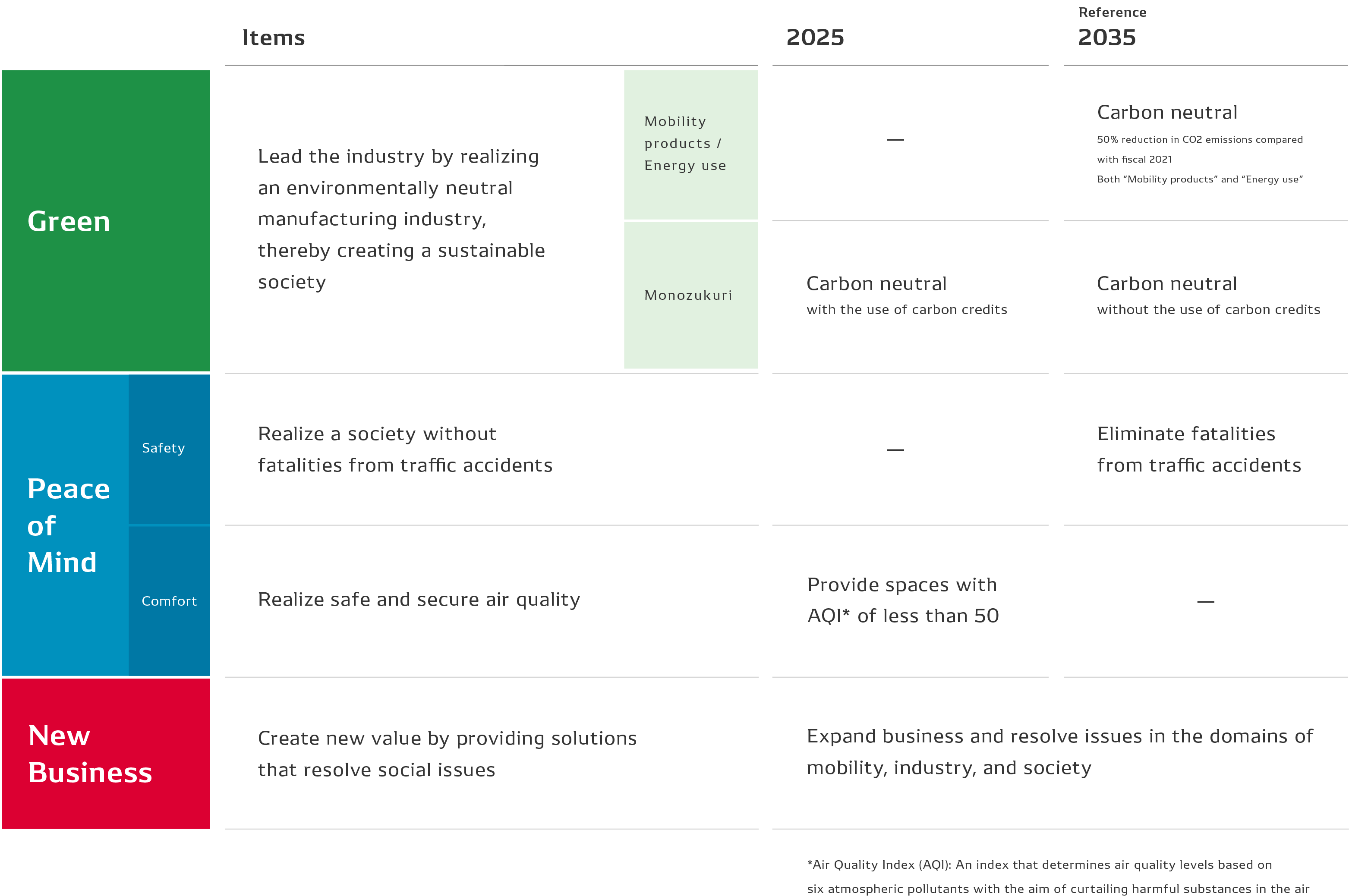 We set aims by 2025 (or 2035 depending on the item) for each value we will provide and strive to achieve them.