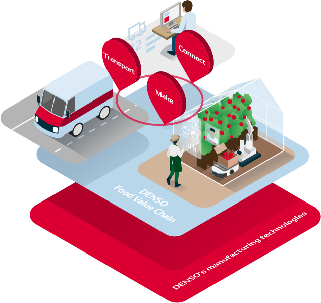 Technology development of on-board refregiration unit to correspond to ever-changing market. DENSO assures delivery of safe and secure food to customers with an expanded product line-up adapted to new logistics needs.