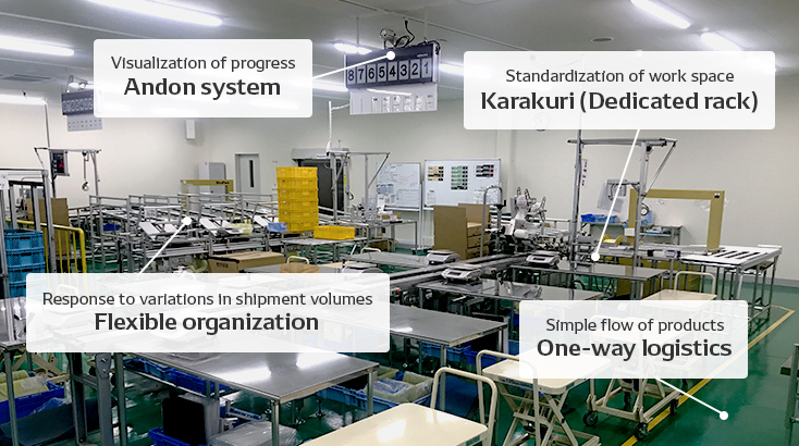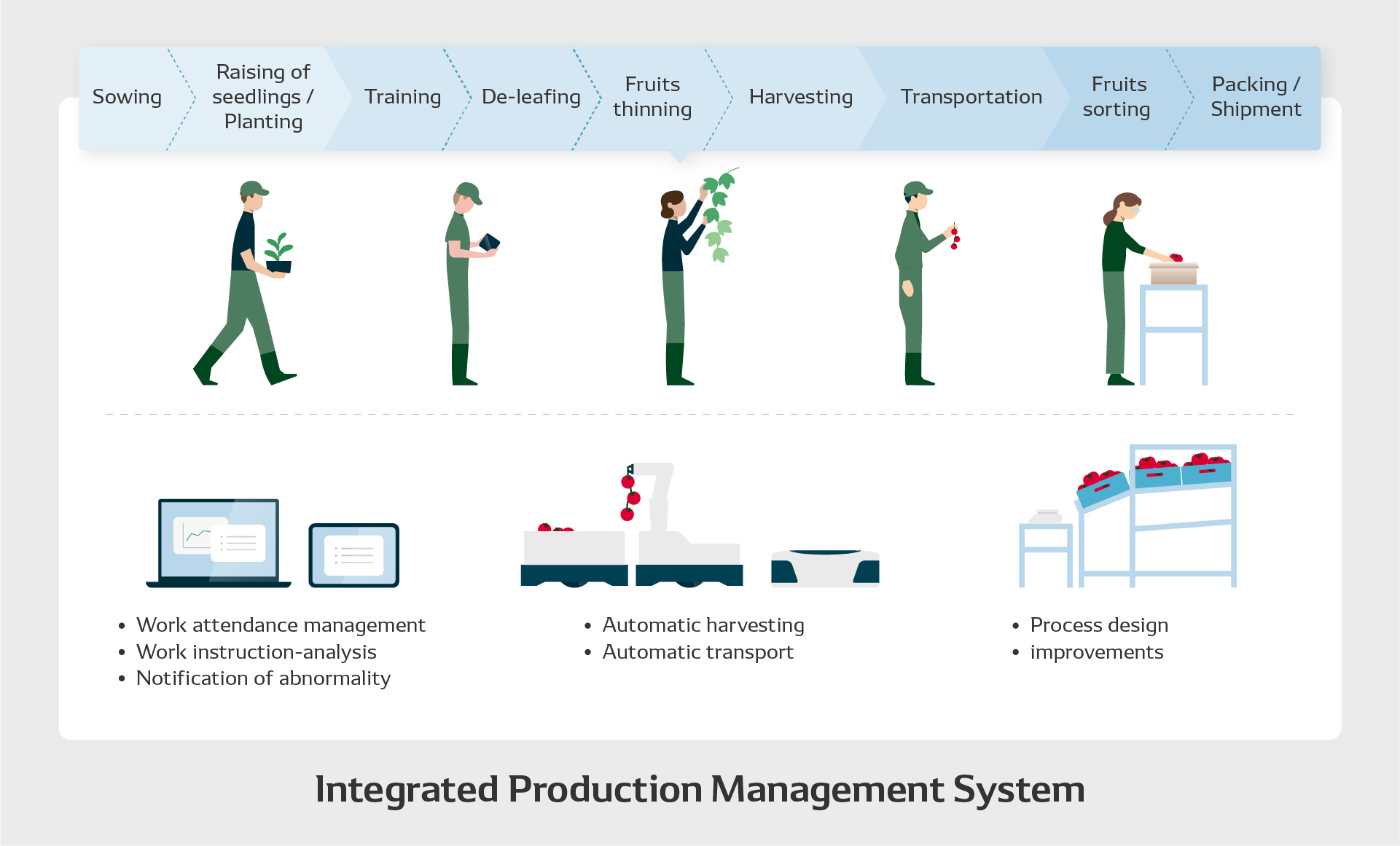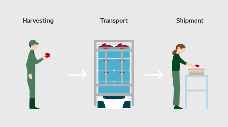 From harvesting to shipping, optimize all processes from the designing stage to eliminate overburden, unevenness, and waste from operations performed by workers and robots, leading to improvement of efficiency.