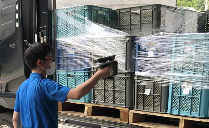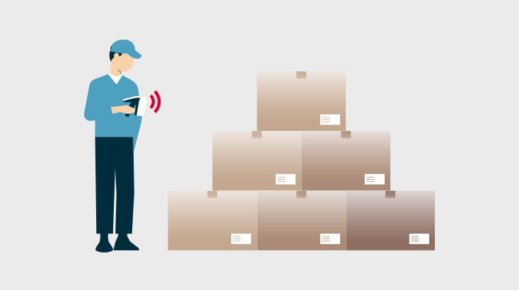 • Non-contact collective product inspection using RFIDs to reduce the burden of operators confirming quantities, improve quantity accuracy, and update the inventory status live.