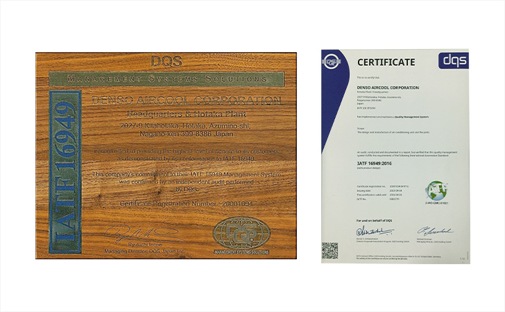 DENSO AIRCOOL, in compliance with global quality management system standards, has acquired the IATF16949 certification, which is a quality system standard of the automotive industry that is related to automobile-related products, and the ISO9001 certification, which is related to other types of components.