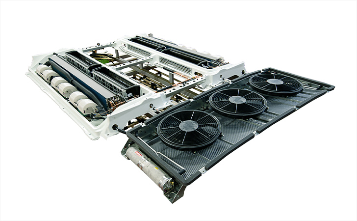 We developed an electric heat-pump air conditioning system capable of conditioning large spaces specifically for buses. This system, designed to be environmentally friendly, caters to Fuel Cell Electric Vehicles (FCEV) and Battery Electric Vehicles (BEV).