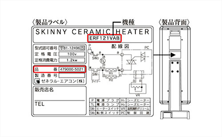 つきましては、お客様の安全に万全を期すために対象製品をすべて回収させていただきたく、お手数ではございますが、「スキニー セラミック ヒーター」をお持ちのお客様は、お持ちの製品の機種と品番をご確認いただきますようお願い申し上げます。