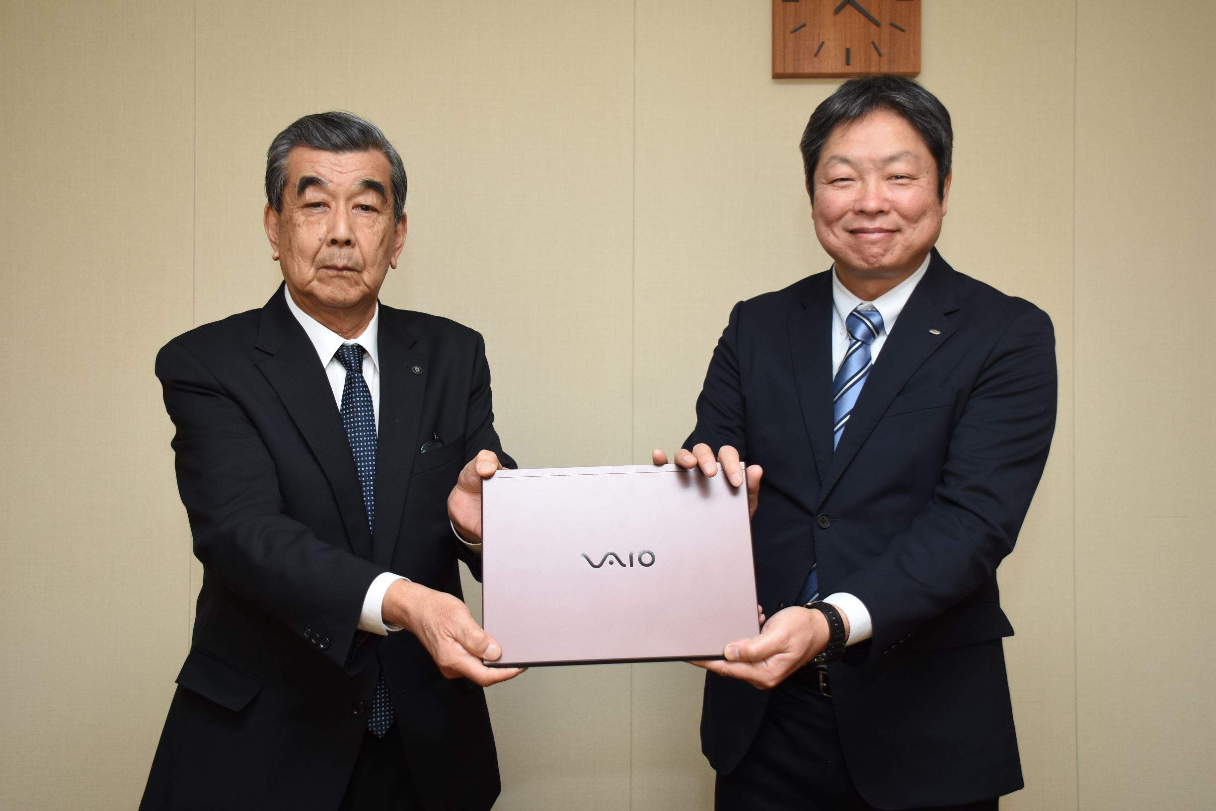 2月6日、安曇野市役所を訪問し、宮沢社長から安曇野市中山市長へ防災備品を寄贈しました。当社による安曇野市への防災備品寄贈は2008年度より継続しており、今回で18回目となります。今回は、安曇野市内に本社を置くVAIO株式会社のノートパソコンを寄贈しました。ノートパソコンは、災害発生時に開設される避難所において、避難者の受付・名簿作成・情報管理等に活用される予定です。