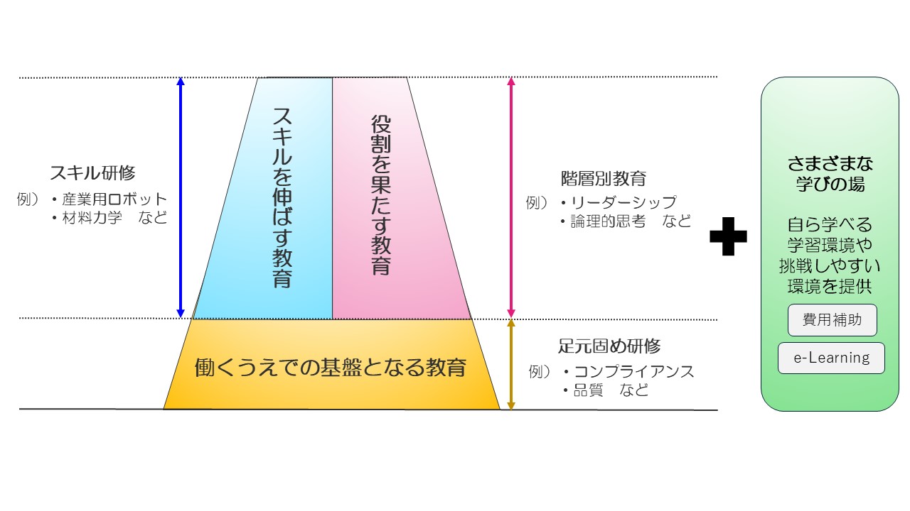 働くうえで基盤となる教育を土台に、一人ひとりが「役割を果たす教育」と「スキルを伸ばす教育」を行い、モノづくりのプロフェッショナルとして着実に成長できます。
