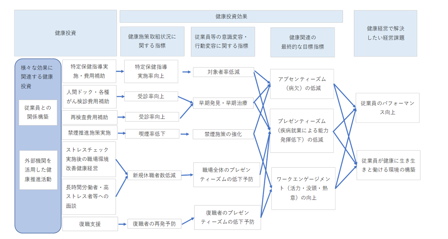 健康経営で解決したい経営上の課題について、期待する効果や具体的な取り組みのつながりを戦略マップとして可視化しました。