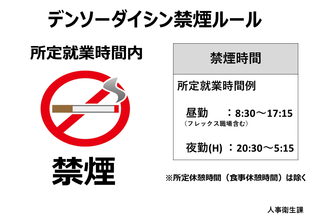 個人への卒煙支援として、卒煙プログラム「アスキュア」補助制度を喫煙者全員へ情報展開しています。喫煙率は良化傾向にあり、今後も継続的に取り組みを行っていきます。また、2023年度からは禁煙時間を拡大し、昼休憩以外の就業時間内は禁煙として実施しています。
