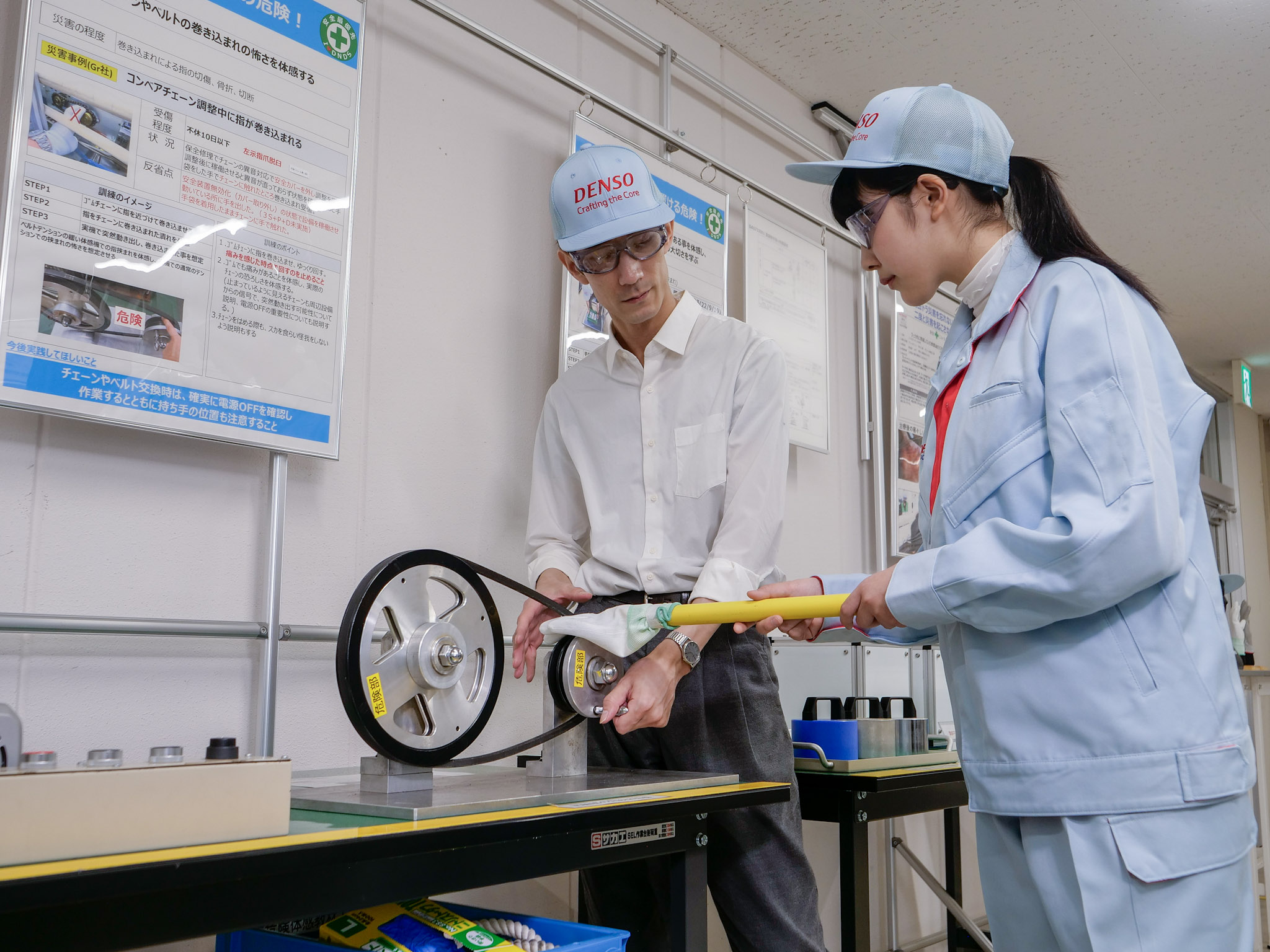 デンソーダイシンで働く人を事故や怪我から守るために、危険を疑似体験してもらい、「災害の恐ろしさ」や「ルールを守る大切さ」を伝えています。「誰一人職場で怪我をさせない」という想いのもと、様々な安全活動に取り組んでいます。