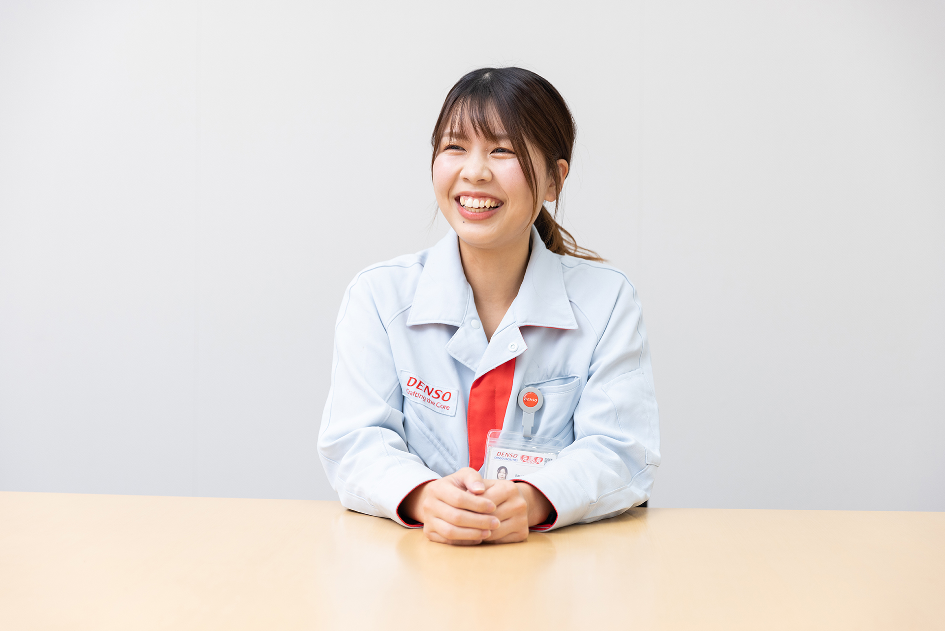 現在はデンソー本社内の各ビルや工場から排出される水質の管理を行っています。排水をキレイにし、川へ放流する前の分析作業を行なっており、いずれも環境に関わる大事な仕事です。保全作業では、工具を使ってポンプを分解し部品交換を行うことも。やりがいを感じるのは、トラブルが起きた際に自分のスキルで対応・解決でき、事業部の方々から「ありがとう」と感謝の気持ちを伝えられた時。マンホールの蓋を開ける際などの力仕事は大変ですが、男性社員がすぐにサポートしてくれるので安心です。しかし、こうした女性には負担が大きい作業に対して、今後は女性の視点から改善提案をしていき、女性でも作業しやすい環境にしていきたいと思っています。